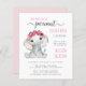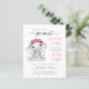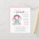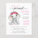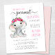 Um belo convite para bebês, amigável em orçamento, com "Our Sweet Little Peanut Is On Her Way" escrito em uma mistura de tipografia de cinzas cor-de-rosa e macia e um roteiro bonito com pestanas, e uma aquarela de um elefante bebê com uma coroa floral na cabeça. Personalize os nomes do bebê Irl e da mãe na tipografia rosa e os detalhes do borrifo na simples tipografia moderna das cinzas.