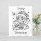 Página de Natal com um elfo adorável segurando uma simples página de colorir preto e branco de ursinho de peluche. Cartão de Natal Colorido-me. Você pode editar o texto em se desejar na área de personalização.