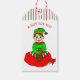 A mão puxou o elfo festivo branco sentado no cheio do saco de presentes dos Papais noeis. Etiqueta de presente de Natal verde, vermelho e branco.