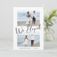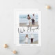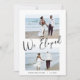 Anuncie seu melhor dia com nosso cartão de elopemento de casamento. Apresentações "Nós Elografamos" na escrita moderna, centradas entre duas fotos de casamento, com nomes, data e uma mensagem pessoal no verso.