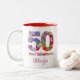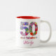 50 e fabulosa caneca de café moderna festa de aniversário Uma ideia perfeita para um quinquagésimo aniversário, seja como um presente maravilhoso para a aniversariante, ou como alternativa para surpreender seus convidados de festa. Flores coloridas fotografadas e padrão desenhado com amor. Você pode personalizá-lo com o nome da aniversariante. Aproveite!