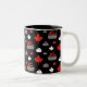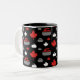 Caneca de café que caracteriza uma folha de bordo e que ondula o teste padrão da rocha no vermelho, no branco e no cinza no fundo preto. Aperfeiçoe para encrespadores e fãs de ondulação.