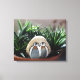 Fotografia decorativa de dois pinguins pintados na pedra fluvial em um pote com suculentos.