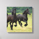 Par de cavalos negros frisesianos galopantes em um campo.