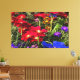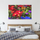 Um motim de flores coloridas de primavera em vermelho vivo, azul, roxo, rosa e laranja. O foco está em uma flor de fogo no primeiro plano, com um arco-íris de flores ao seu redor. Este jardim florístico multicolorido 3D foi criado em Vue.