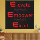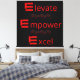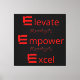 Uma série de ícones "E" vermelhos ousados, cada um seguido de uma palavra poderosa: "Elevate", "Empower" e "Excel". As palavras são acompanhadas por linhas onduladas que sugerem movimento ou progressão, simbolizando a jornada rumo ao crescimento pessoal e à conquista. É uma forma excelente de inspirar a nós mesmos e aos outros para lutar pela excelência.