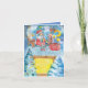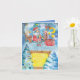 Em cima de um Cartão de Saudação de Natal Dobrado - Papais noeis e uma rena estão pendurados no telhado a vomitar numa xícara de cacau quente. As cores são azul claro e vívido, vermelho, amarelo com toques verdes.
