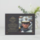 Um convite sofisticado com guarnição do ouro contra um fundo escuro que caracteriza um rolo decorativo para iniciais ou data e seu nome. Design por Freepik.