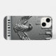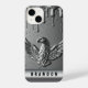 Um emblema de águia de metal prateado detalhado colocado contra um fundo industrial texturizado com efeitos de tinta pingando. O relevo embutido, semelhante ao cromo, evoca força, herança e habilidade artesanal decorativa moderna em monocromia.