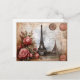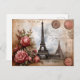 Uma aventura parisiense aguarda enquanto você abre este postal encantador. Uma Torre Eiffel graciosa fica alta no cenário de um pôr do sol cor-de-rosa pastel. Delicar rosas cor-de-rosa no cheio enrola a torre, adicionando um toque de romance e calor.