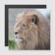Na imagem, um leão macho se posiciona orgulhosamente contra um fundo leve. Seu homem majestoso armou seu rosto nobre, exuando força e autoridade. Aos seus pés está uma vibrante folha verde, simbolizando a harmonia entre o rei das bestas e o mundo natural