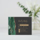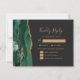 A borda esquerda deste elegante cartão de cercado RSVP de casamento moderno apresenta uma borda verde esmeralda de aquarelas, aparada com uma falso brilho dourado. O título "Resposta gentil" aparece em um script de escrita manuscrita dourado, com o texto restante em fontes copperplate e itálico em um fundo fora de preto. Inclui espaços para seus convidados iniciarem sua escolha de três entradas editáveis. O verso apresenta um design emerald verde e dourado.