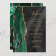 A borda esquerda deste elegante cardápio moderno de casamento apresenta uma esmeralda verde aquarela agata borda com falsa brilho dourado. O texto personalizável combina um script de escrita manual branco dourado e fontes de impressão em um fundo de cor d'água preta. O verso apresenta um design emerald verde e dourado.