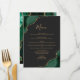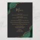 Este elegante cardápio moderno de casamento apresenta cores aquáticas esmeraldas e verdes, cantos aparados com brilho de ouro falso. O texto personalizável combina o script de escrita manual branco dourado e as fontes de impressão em um fundo preto de ardósia. O verso apresenta um design emerald verde e dourado.