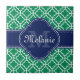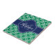 Padrão de latência marroquina esmeralda verde e branca com um marinho inicial de monograma. Por cima do padrão verde e branco da lista, há um rótulo marinho azul e branco que contém uma letra monográfica e um modelo de nome para personalizar.