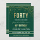 Emerald | Convites de festas de Confetti Dourados do orçamento. Este convite de aniversário formal, elegante, moderno, de quadragésimo é adequado para homens ou mulheres. Inclui linhas limpas de ouro, guião gótica em maiúsculas e na moda e texto sofisticado de folha de ouro falsa num fundo verde esmeralda com chás de espumantes, dourados confetti e galerias de festas.