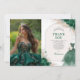 Este cartões de agradecimentos gráfico e adorável de fotos da quinceañera apresenta elegantes flores verdes esmeraldas esmeraldas, uma tiara brilhante cintilante e duas borboletas fluentes. Clique no botão "personalizar mais" se quiser reorganizar e formatar o estilo e a posição do texto.