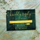 Um cartão de RSVP de celeiro boho de madeira rústica esmeralda verde com seus detalhes definidos em tipografia dourada moderna. Projetado por Thisisnotme©