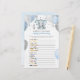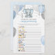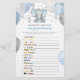 Este divertido jogo de chá de fraldas apresenta elefante de bebê cinza e azul com balões e confete. Seus hóspedes podem resolver as rimas dos berçários decodificando os emojis/emoticons. Chave Emoji: 1. Diddle Diddle 2. Twinkle Twinkle Pequena Estrela 3. Itsy Bitsy Spider 4. Cinco macacos pulando na cama 5. Dickory Dock 6. O velho MacDonald tinha uma Fazenda 7. Enche O Pequeno Bebê 8. Rub-a-Dub-Dub 9. Menina Muffet 10. Um, Dois, Meu Calçado 11. Jack e Jill 12. Fila Row Row Seu Barco 13. Havia uma velha mulher 14. Star Light Star Bright 15. Baa, Baa, Ovelha Negra
