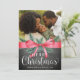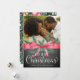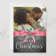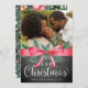 Cartão com fotos festivo apresenta suas imagens favoritas adornadas com uma ilustração de arco de fita vermelha e grampos de pinheiro verde. "Feliz Natal" aparece debaixo de letras brancas sobre um fundo de chalkboard rústico. Personalize com seus nomes e o ano.