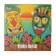 Rostos coloridos e divertidos de máscara tiki com um pôr do sol de praia e plantas tropicais. Personalize o texto para qualquer nome ou frase. Excelente para festa ou evento do Bar Tiki.