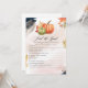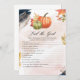 Projetado para nossa coleção de chás de fraldas Pequenos Pumpkin, este personalizável Find The Guest Game Card oferece fundo cor-de-rosa pincelado, abóbora verde e laranja, texto brilhante rosa e folhas douradas com fontes de escrita manual. Itens correspondentes disponíveis.