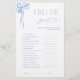 Trazendo hóspedes e charme sem esforço, Find the Guest é um disfarçado quebra-gelos projetado para transformar qualquer chá de panela em um encontro vivo e conectado. Com uma série de instigadores, este jogo incentiva os hóspedes a misturar, compartilhar histórias e descobrir fatos divertidos uns sobre os outros — tudo isso celebrando a futura noiva. A delicada ilustração da fita azul e a tipografia clássica adicionam um toque de elegância subestimada, assegurando que esta peça se misture perfeitamente num cenário de evento sofisticado. Perfeito para chás de panela, festas de noivado ou até jantas de ensaio, este jogo foi projetado para criar conversas memoráveis e conexões significativas. Quer os hóspedes se encontrem pela primeira vez ou reacendam velhas amizades, esta atividade promove uma atmosfera de calor e camaradagem. Para designs de correspondência, cores alternativas ou adaptações personalizadas, o designer está encantado em colaborar para aprimorar a estética coesa do seu evento. Copyright Anastasia Surridge, todos os direitos reservados.
