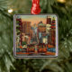 Imagem colorida e vintage de cartão postal de São Francisco mostrando os icônicos bondes, Ponte Golden Gate e Chinatown, repropostos em um enfeite de cerâmica.