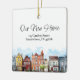 Celebre a alegria de um novo começo com este enfeite de Natal em cerâmica lindamente trabalhado, projetado especialmente para corretores de imóveis oferecerem como um presente de encerramento atencioso e duradouro. Este enfeite quadrado apresenta uma encantadora ilustração em aquarela de uma vizinhança suburbana ao longo da borda inferior da frente, adicionando calor e charme. Acima, a frase "Nossa Nova Casa" é escrita de forma elegante em uma fonte cursiva moderna, enquanto o centro exibe o endereço personalizado da propriedade, tornando-o um souvenir pessoal para a primeira temporada de festas dos seus clientes em seu novo espaço.