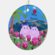 Um fundo tropical divertido com bolas de Natal, uma palmeira, muitos tulipas e dois hipopótamos felizes adoráveis!