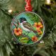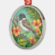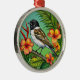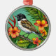 Ilustração colorida de um pássaro empoleirado em um galho rodeado por flores tropicais e folhagens. O pássaro tem uma cabeça preta, plumagem marrom e branca, e está colocado contra um fundo verde vibrante.
