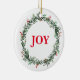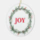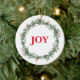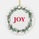 Este ornamento cerâmico de Natal é mostrado com um impressão e texto festivos de morango de férias: JOY. Personalize este item ou comprar como está. Imagem do stock