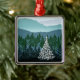 O pinheiro solitário AZUL do NATAL A do CUME com luzes brancas está em uma floresta com as montanhas no fundo.