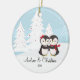 Nossos enfeites de natal feitos sob encomenda datado originais do amor do pinguim caracterizam um casal bonito do pinguim ajustado em um fundo da neve da árvore de Natal! Personalize com sua informação e data e você são todos ajustam-se para ir! Presente datado maravilhoso da lembrança para um primeiro Natal dos casais e uma grande adição a você coleção dos enfeites de natal.