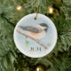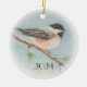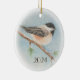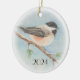 Uma galinha adorável senta-se pacificamente num membro coberto de neve entre os flocos de neve que caem no inverno. De uma pintura de aquarela original.
