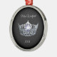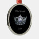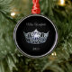 Enfeites de natal mostrado em forma redonda com uma coroa prateada com destaque azul da meia-noite no centro, com texto do script do rico em Cinza prateada e fundo preto. Mostrada com fita vermelha e prateada. Personalize este item com o seu nome pessoal, data ou outro. O nome de exemplo mostrado é "Miss Westfield".