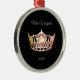 Enfeites de natal mostrado em forma redonda com uma bonito coroa colorida cor de laranja, com texto de script de rico em Cinza Prateada e fundo preto. Mostrada com fita vermelha e prateada. Personalize este item com o seu nome pessoal, data ou outro. O nome de exemplo mostrado é "Miss Westfield".
