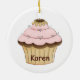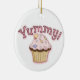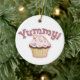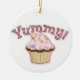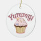 Enfeites de natal colorido, com gráficos brancos de cupcakes bonito, na frente e atrás, com texto gráfico cor-de-rosa, na frente, lendo Yummy. Personalize o texto marrom, no verso, para dizer o que quiser. Excelente para quem ama doces.