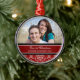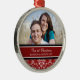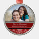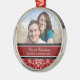 Ornamento da foto do Natal dos casais ø customizável com seus próprios foto, nomes e data no vermelho elegante, cor damasco floral clássica preto e branco. Uma maneira à moda de decorar sua árvore ou casa de Natal para os feriados. A maneira perfeita de recordar junto seu primeiro Natal como um casal.