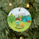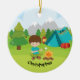 Campista pequeno personalizado que caracteriza um menino com uma barraca, um saco de sono & uma lanterna ajustados em uma árvore & em um fundo da montanha. Um presente do Natal da maravilha sure a ser estimado por muitos próximos anos.