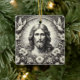 Um Enfeites de natal preto-e-branco lindamente trabalhado, com uma renderização de Jesus, ao estilo da gravação, cercado por flores delicadas e duas pombas pacíficas. O intrincado design adiciona um toque eterno e espiritual à sua decoração de férias. Personalize a parte traseira com uma mensagem pessoal, nome ou data para uma manutenção exclusiva e significativa.