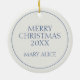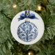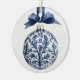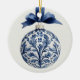 Este ornamento cerâmico redondo apresenta um belo Enfeites de natal azul-marinho e chinoiserie branca numa fita azul correspondente. Personalize com sua escolha de nome e mensagem especial de feriado no verso. Excelente para etiquetas de presentes e favoritos para festas.