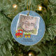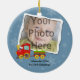 Foto personalizada fotógrafa divertida e fofa, com nomes de Natal. Design de trem de inverno para bebês ou crianças. Pode ser o primeiro ornamento de Natal de um bebê excelente. Adicione sua própria foto digital e manchete. Possui uma moldura branca e neve com fundo azul claro e flocos de neve brancos juntamente com um adorável trem colorido de chocolate de brinquedo em vermelho, amarelo, laranja e verde! Uma lembrança perfeita para qualquer ano especial de feriado.
