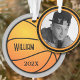 Ornamento de árvore de Natal de modelo fotográfico. Grande imagem de basquete laranja com duas linhas de texto personalizado para nome e data de ano. Adicione a foto de um menino ou menina às costas. Este ornamento é acrílico. Temos um com esse design em cerâmica também.
