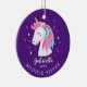 Personalize o Enfeites de natal de unicórnio fofo da irmã intermediária e datada com um unicórnio doce com um azul-turquesa, rosa e roxo e enquadrado com flores delicadas colocadas sobre um fundo roxo escuro.