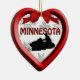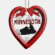 Um design gráfico de flocos de neve e um movente de neve em um quadro vermelho estilo 3D em um Enfeites de natal de forma cardíaca Minnesota. O ornamento tem modelos de texto para sua personalização. ©2012charmanepaulson