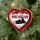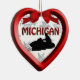 Um design gráfico de flocos de neve e um movente de neve em um quadro vermelho estilo 3D em um Enfeites de natal Michigan em forma de coração. O ornamento tem modelos de texto para sua personalização. ©2012