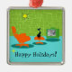 Diz-se que os cães têm donos e os gatos têm funcionarios. O felino neste Enfeites de natal de Gatinho de Idade de Espaço Retroativo Personalizável não conseguiu concordar mais! A design de arte minimalista estilo 1960 apresenta um gato preto elegante numa sala de estar moderna de meio século. A sala sofisticada apresenta uma parede verde de pedra. O tapete é aqua com sombras. Entre as mobílias da sala estão uma figura amarela, a luz do sputnik, uma cadeira laranja com fezes e uma televisão verde com orelhas de coelho. O gato negro sortudo pode ser visto empoleirado nas bancadas em frente à televisão. Seu show favorito está ligado! Na tela da televisão, podemos ver uma família de televisão clássica, preto e branco, resolvendo todos os problemas da vida em um show de meia hora. Personalize isso para um presente gentil. Esta design é perfeita, se nós próprios o dizemos.
