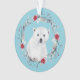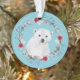 Neste ornamento, um belo urso polar cola de uma poinsettia vermelha e uma coroa de morango. A imagem é colocada sobre um fundo azul claro. O verso do ornamento mantém o texto personalizado em cinco campos fáceis de alterar. Fofo de um avô, pai, tia ou tio para qualquer criança.