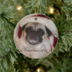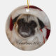 O cão pequeno bonito do pug em um lado com caixas de presente e pata imprime sobre para trás. Personalize o texto a sua escolha.